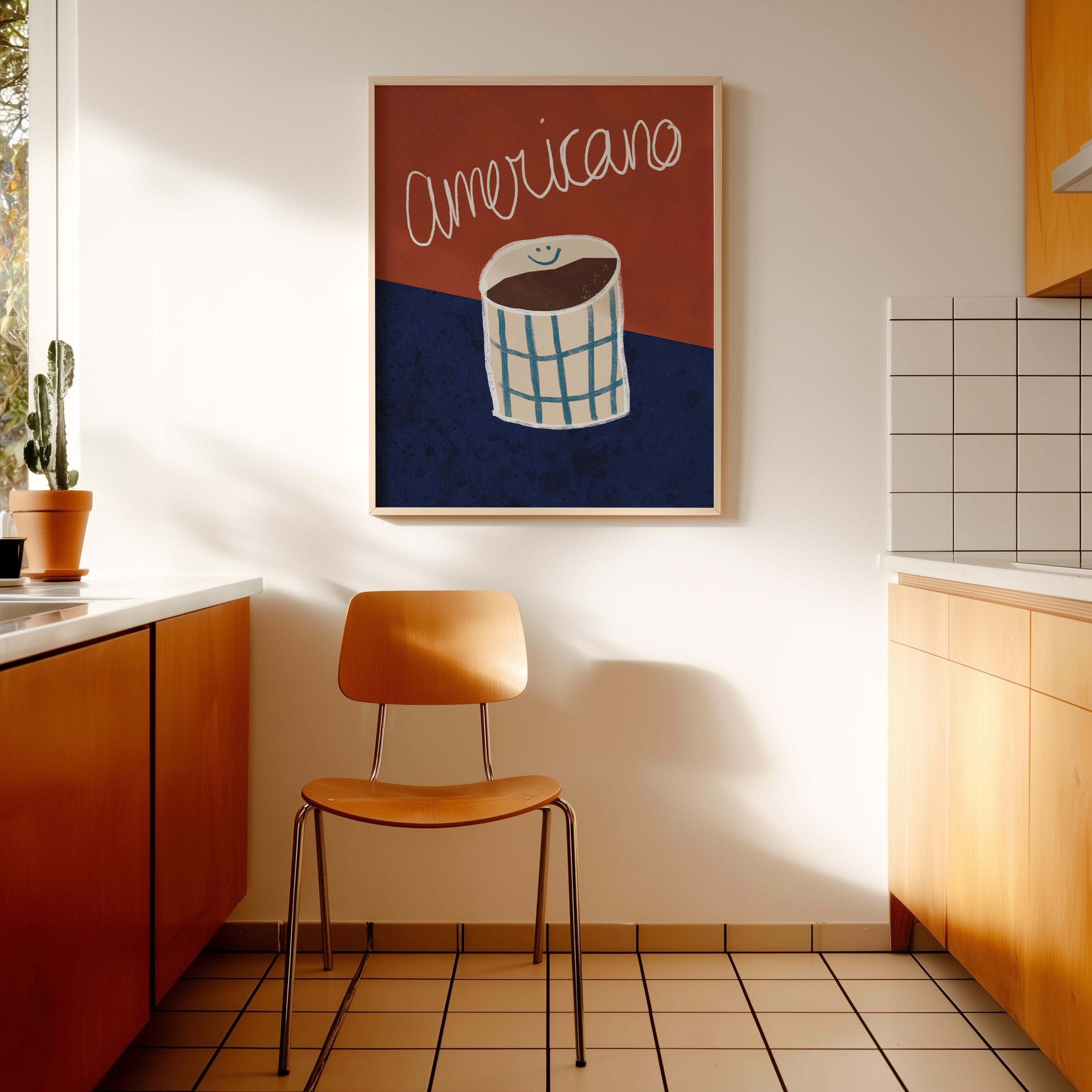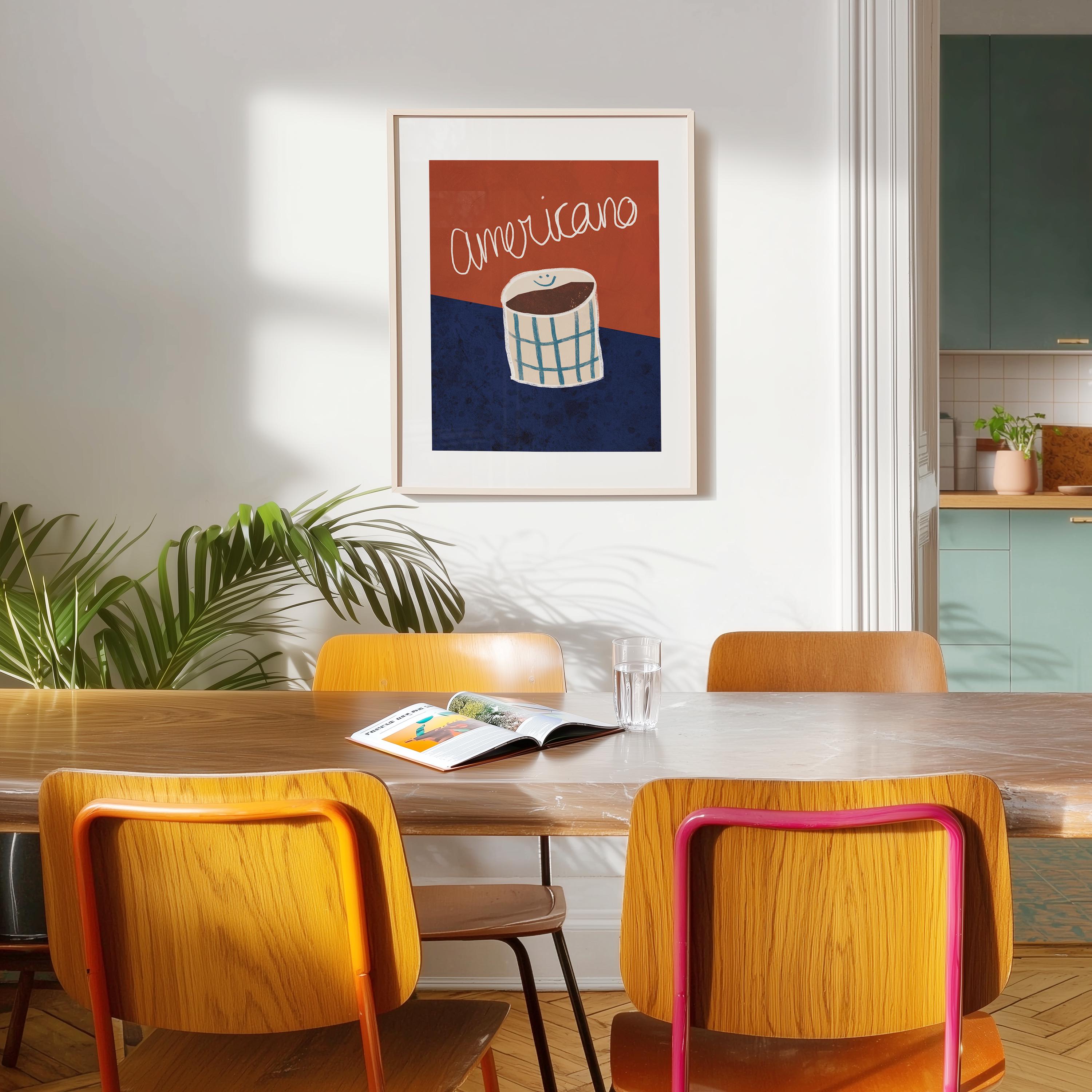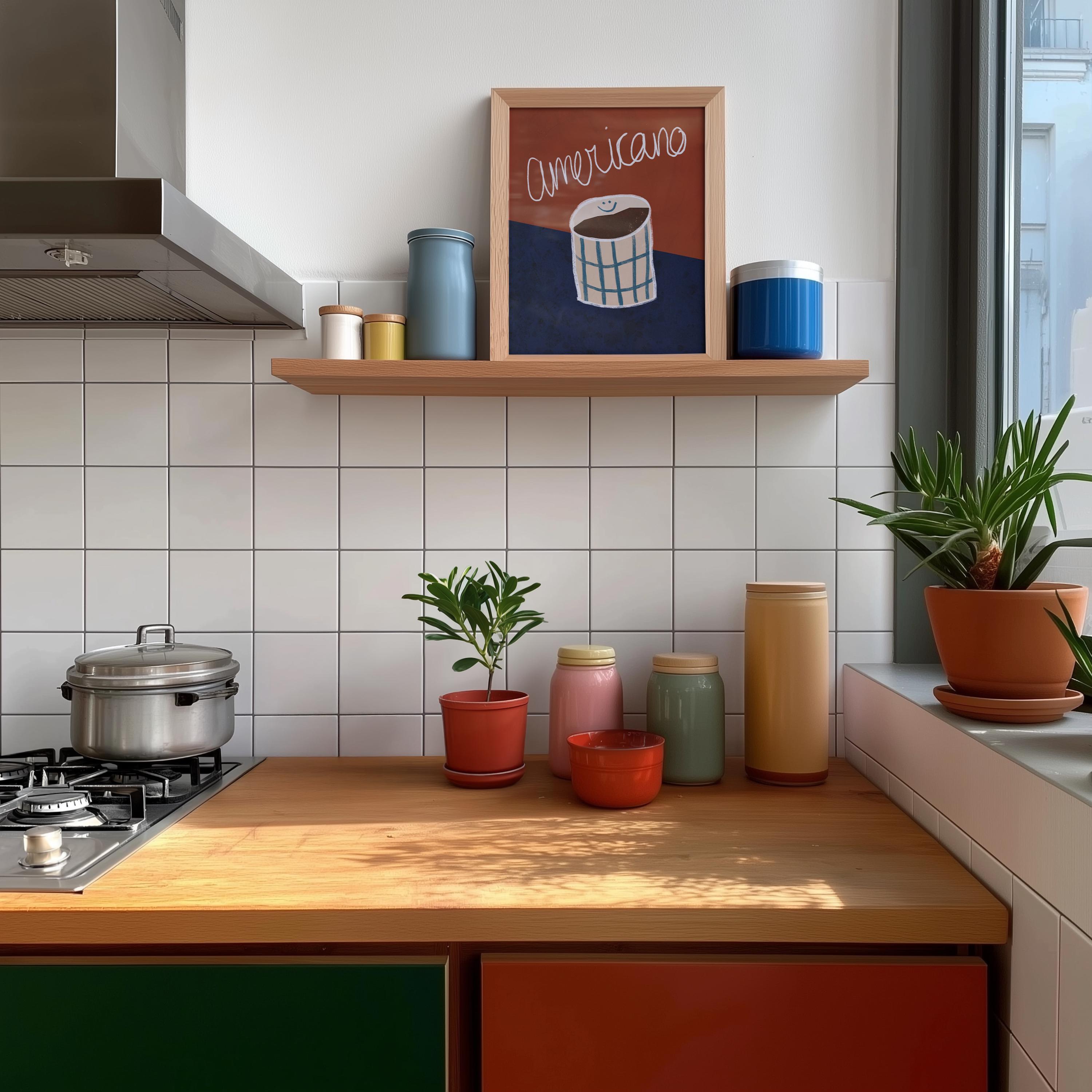 Designed for lovers of clean, Scandinavian-inspired interiors, this bold yet refined print blends deep red and rich blue tones to create a cozy and stylish atmosphere. The perfect statement piece for a coffee corner, modern kitchen, or café-inspired space.