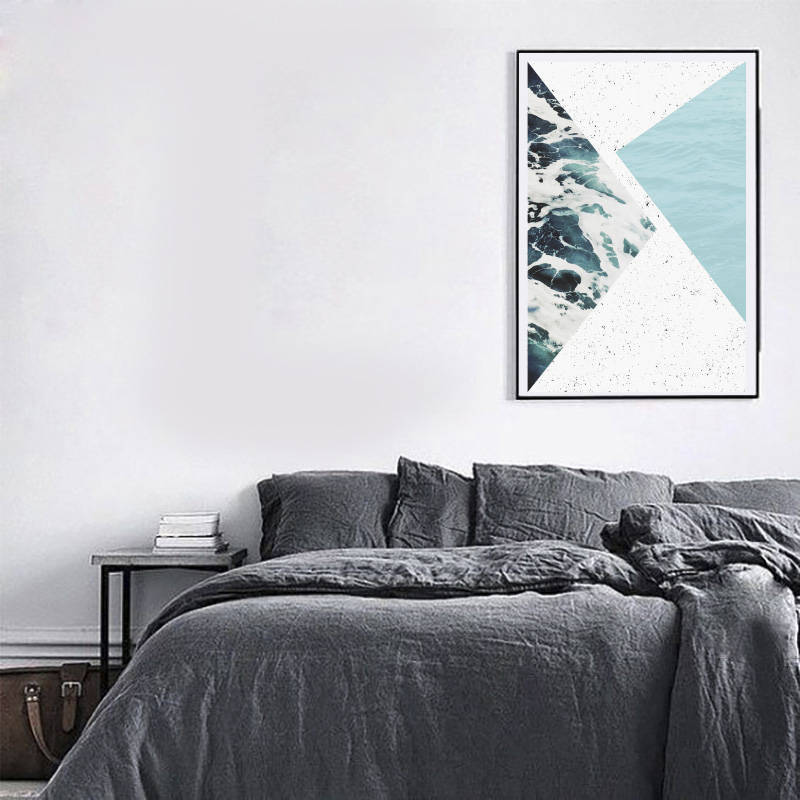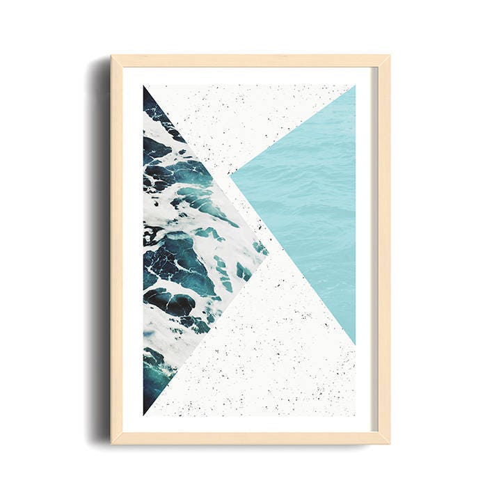 Minimalist poster, art abstract, geometric shapes, triangle, Nordic design, water texture, blue, aqua.